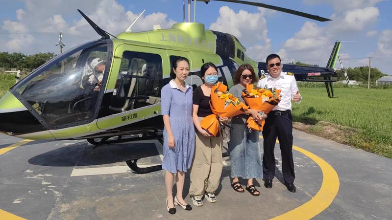 8月18日上午,2名乘客(中間)從昆山乘坐直升機,降落在上海浦東星野飛行基地。新華社 圖