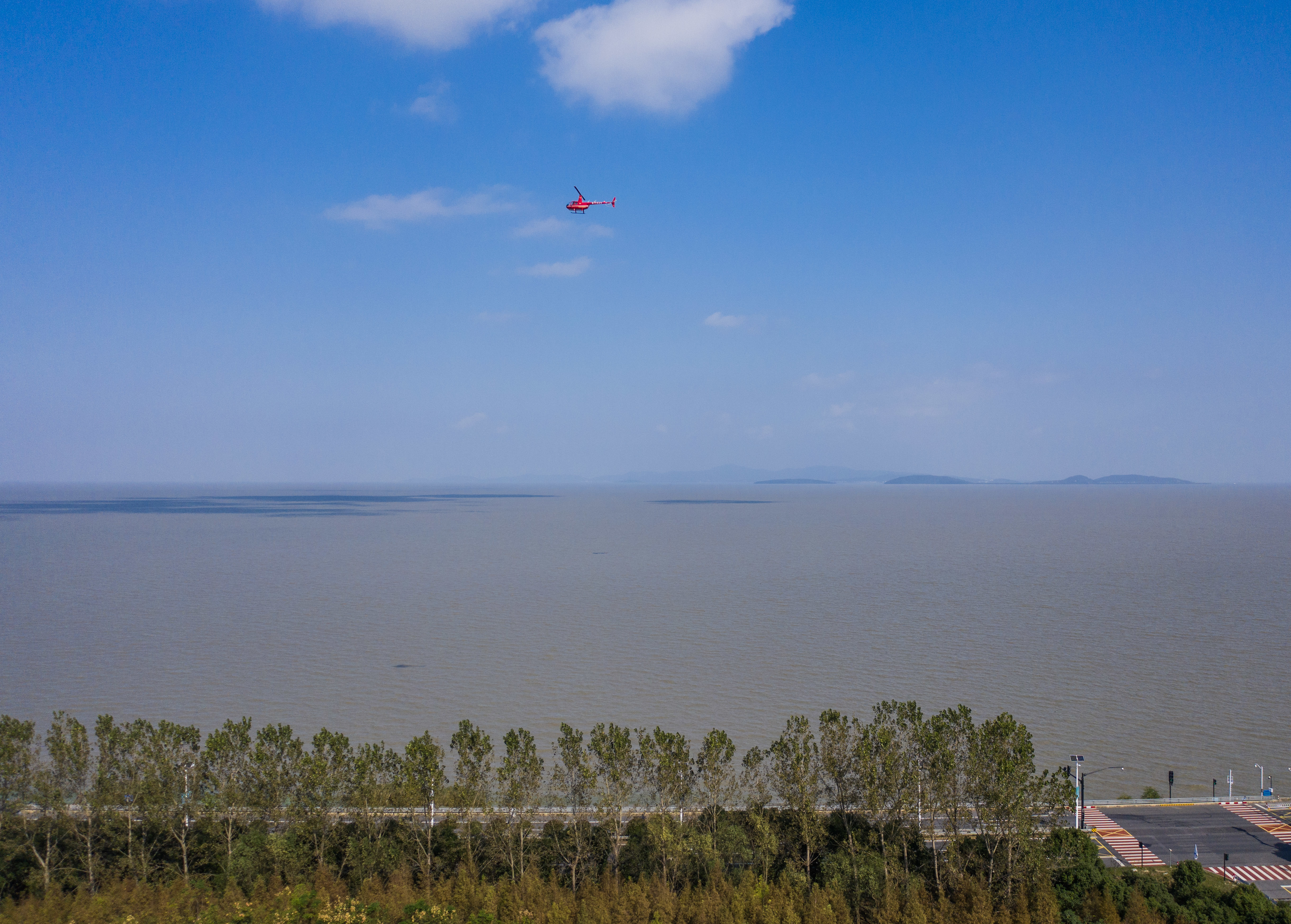 11月5日,游客乘坐米旗通航直升機飛行基地的直升機在空中飽覽太湖南岸美景(無人機照片)。新華社記者 徐昱 攝