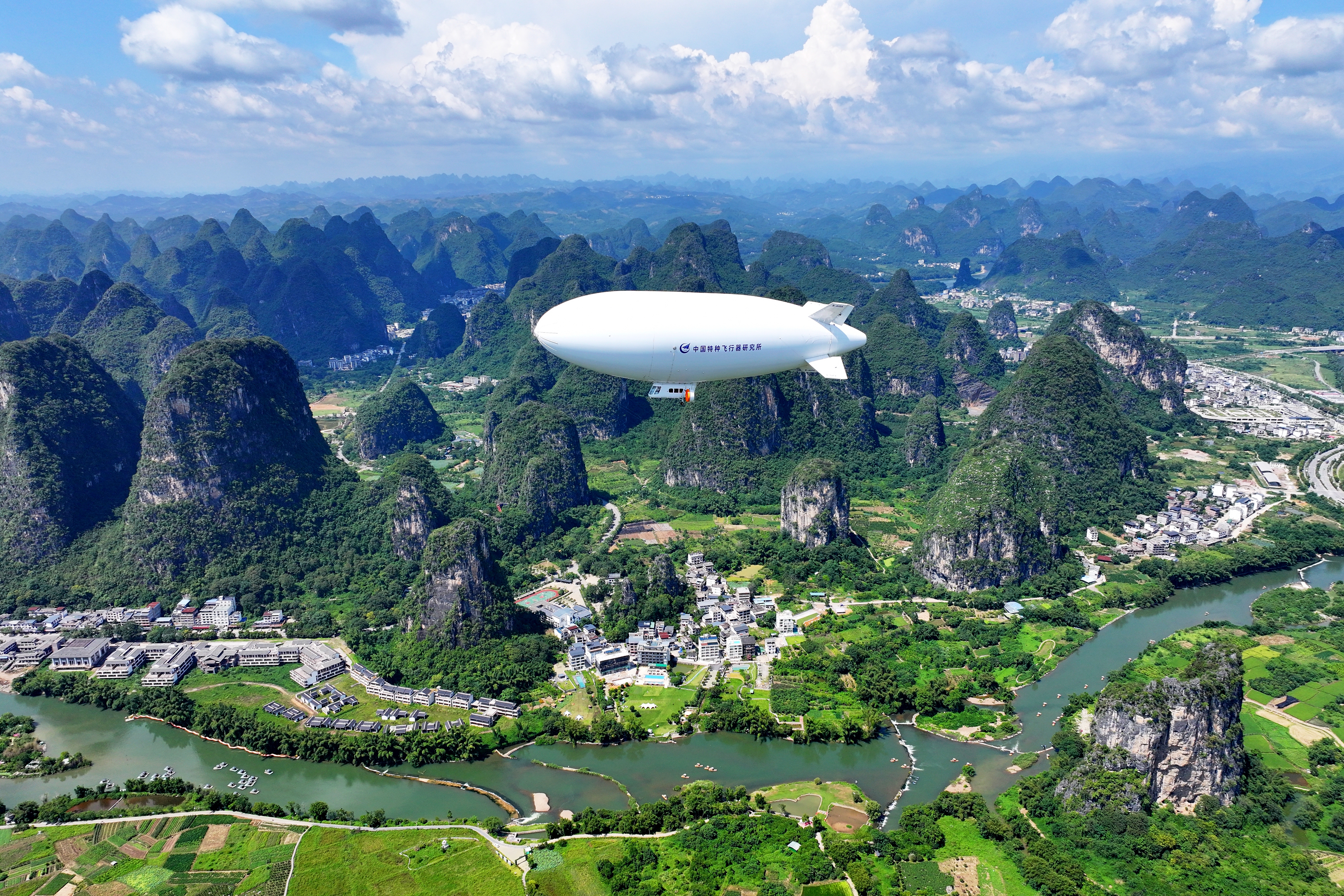 “祥云”AS700載人飛艇在廣西桂林陽朔進行演示飛行。 荊門市委網信辦 供圖
