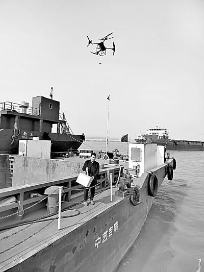 江蘇南京長江匯水上服務區用無人機為船員送貨。新華社發