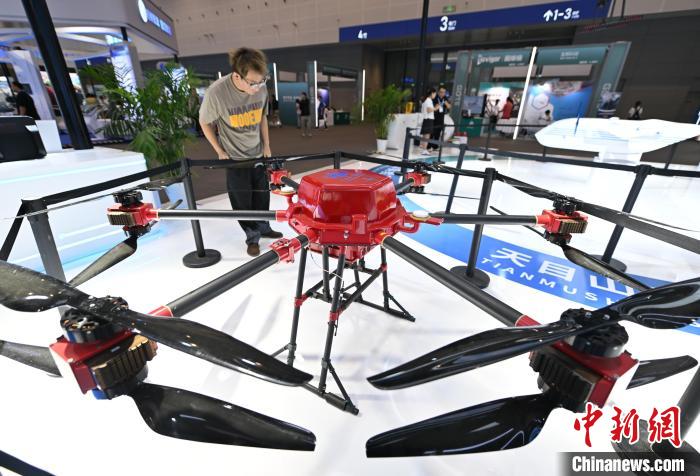 9月26日,浙江杭州,系留式消防無人機引人關注。當日,在第三屆全球數貿會展覽現場,多款高科技飛行器設備亮相,吸引參觀者。中新社記者 王剛 攝