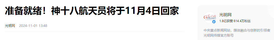 光明網《準備就緒!神十八航天員將于11月4日回家》2024-11-01