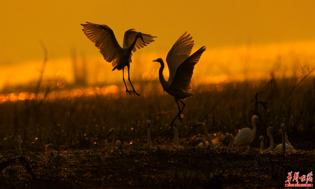 夕陽西下,婁底華勝濕地籠罩在一片金色中,天光云影,青草綠樹,詩情畫意,別有韻味。白鷺是濕地的主人,它們或呼朋引伴追趕夕陽,潔白的羽翼鑲上了金邊;或在搖曳的蘆葦蕩里嬉鬧,像秋天畫卷里的精靈在跳動。