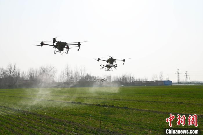 2024年3月,聊城市東昌府區斗虎屯鎮運興農機專業合作社的工作人員在操作農用無人機為小麥噴藥。 (資料圖) 張振祥 攝