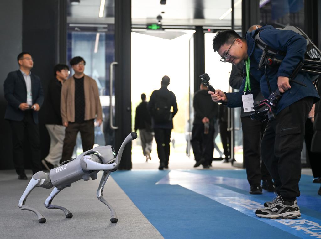 11月19日,在2024年世界互聯(lián)網(wǎng)大會“互聯(lián)網(wǎng)之光”博覽會上,參觀者與一款智能機器狗互動。新華社記者 蔡湘鑫 攝