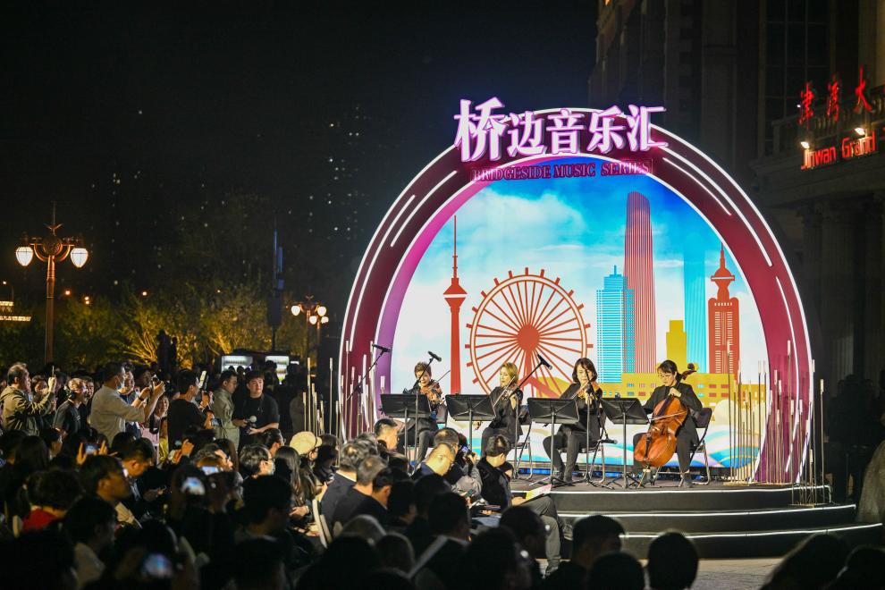 天津交響樂團的演奏者在天津津灣廣場親水平臺為市民游客演出。新華社記者孫凡越攝