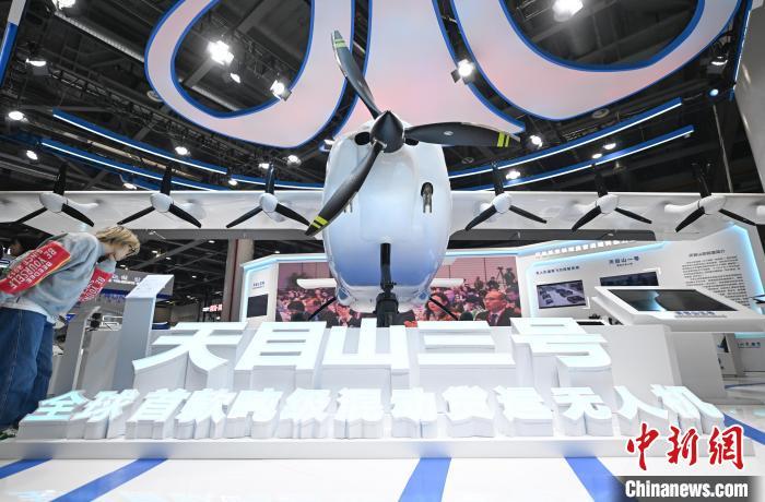 12月5日,天目山實驗室的全球首款噸級超級混動貨運無人機吸引參觀者,該無人機有效載荷630公斤,最大航程1800公里。中新社記者 王剛 攝