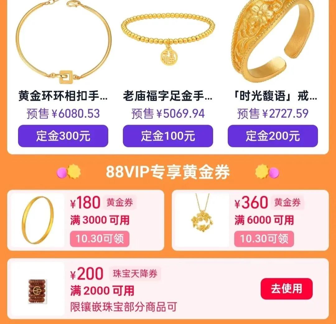 活動時間變了,搶券也成了玄學。慧慧模仿著小紅書上的各種攻略,比如不進主會場,卡著9:59的時間點,找到VIP專屬客服,點擊客服給的會場鏈接,找到專屬黃金券,再反復點擊其中的黃金首飾,下拉優惠。這樣反復操作,慧慧才終于搶到了一張“黃金券”。