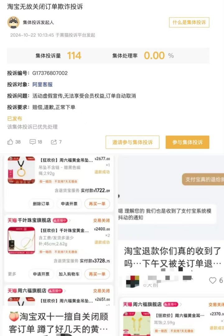 她找到客服想討要說法,給出的理由是存在交易風險。慧慧追根究底,想弄清楚是什么風險,可客服也只有一口一個“親親”道歉,仿佛是冷冰冰的電子生命。其實點開黑貓投訴和小紅書,就會發現雙11期間和慧慧有同樣遭遇的消費者還不在少數。他們的共同點都是使用了平臺發放的黃金券,卻被提示有風險而強制關閉訂單。