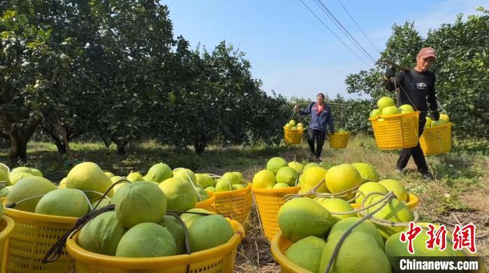 在云霧山香柚產業園,村民們穿梭柚林中采果、挑果、裝筐、搬運,現場一片繁忙。
