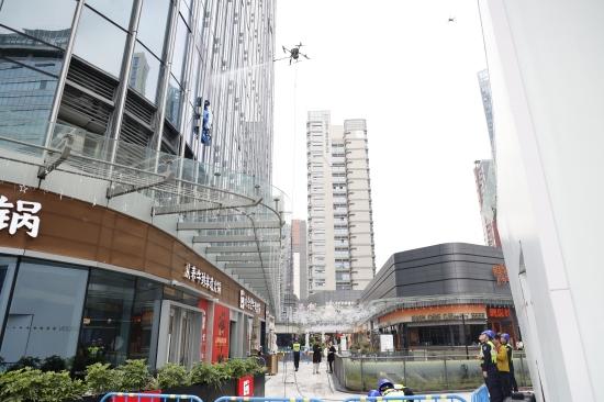 12月9日上午,深圳龍崗區仁恒夢創廣場,一場無人機與“蜘蛛人”的清潔競賽吸引了大量市民觀看:無人機負責噴水和泡沫,機器人根據指令對高層玻璃進行擦拭;另一邊,“蜘蛛人”身著專業的安全裝備,在摩天大樓的外墻上攀爬游走。最終,科技戰勝了勇氣,無人機團隊在時間上節約了一半的時間。