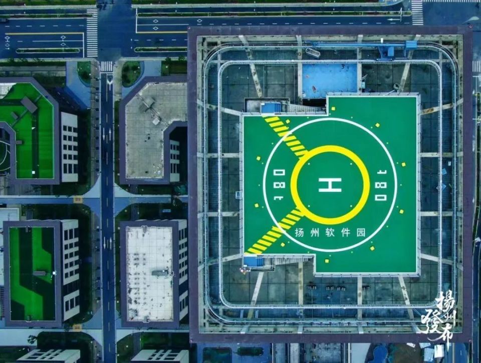 臨時起降點位于揚州軟件園7號樓樓頂,停機坪設計尺寸為23.7米×23.2米方形,機坪中心標高為156.981米,平臺最大起飛重量8噸,可以滿足國內絕大部分民用直升機的起飛承載要求。