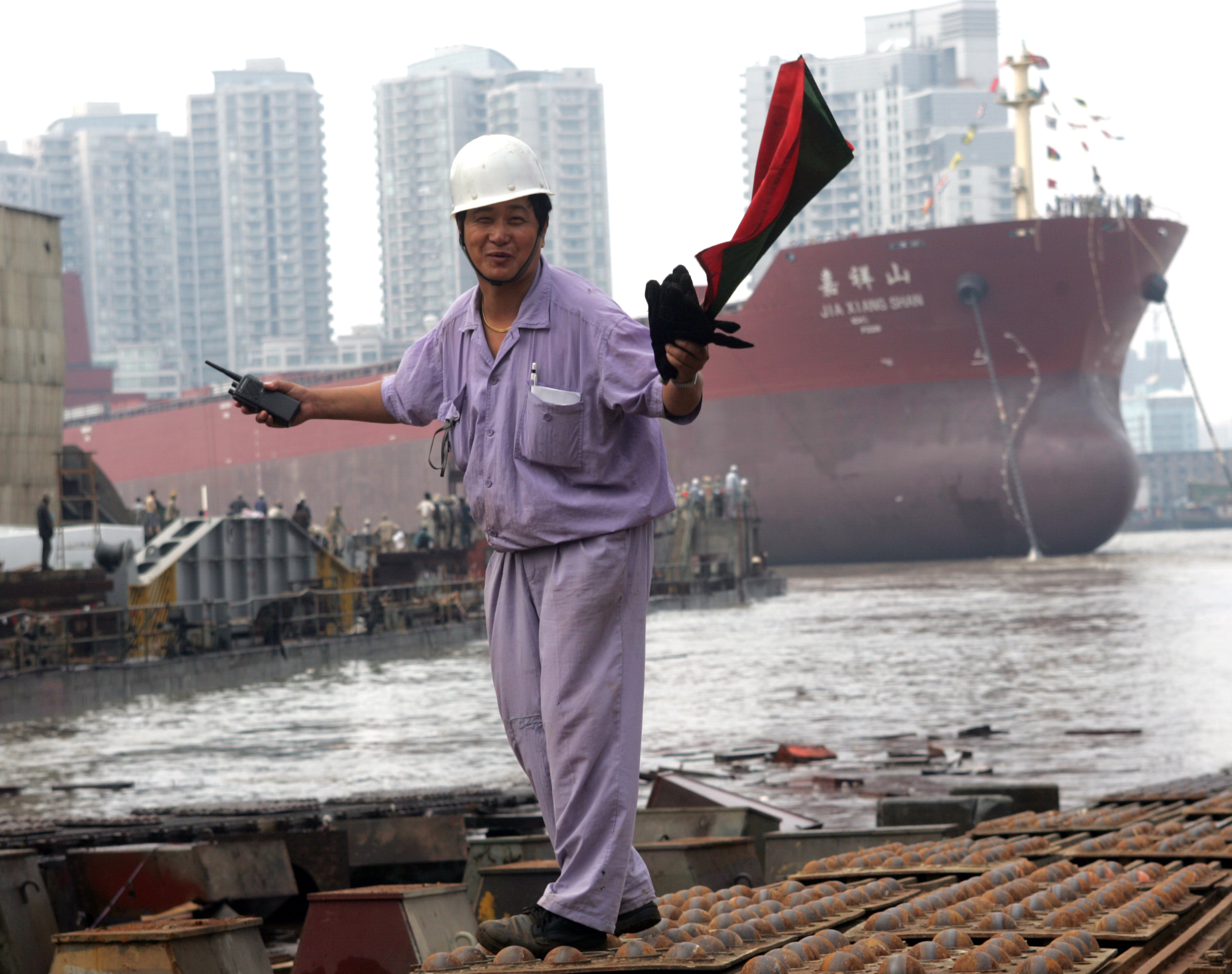 2004年8月20日,上海陸家嘴地區(qū)百年造船史上最后一艘“上海制造”的遠(yuǎn)洋巨輪“嘉祥山”命名下水。隨后,這里的大部分船塢和船臺將逐步拆除,陸家嘴的造船史也隨之畫上“句號”。王杰 攝