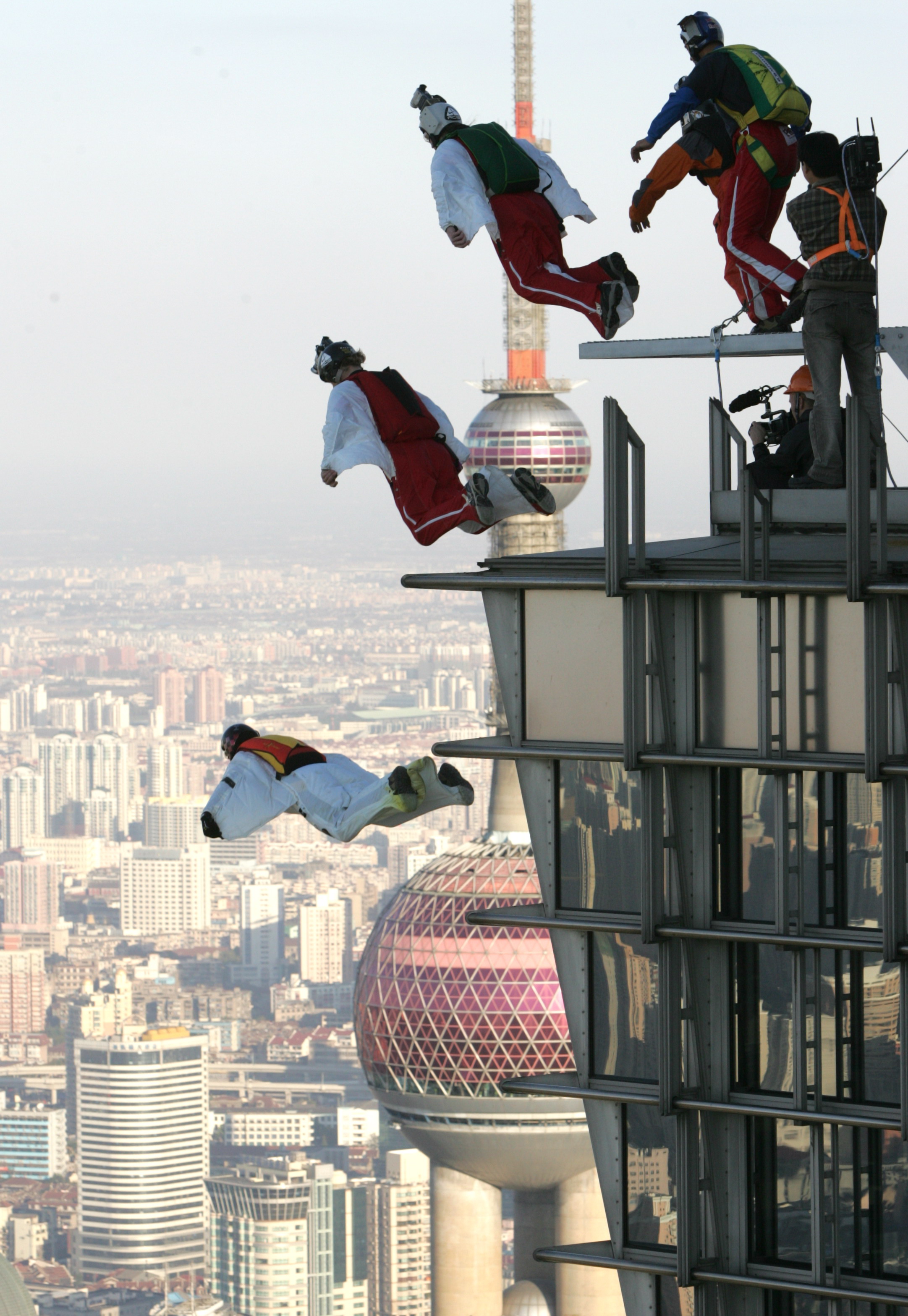 2003年10月6日,15位世界頂級低空跳傘運動員從上海金茂大廈88層平臺跳下,起跳高度345米,超過了馬來西亞 “雙子塔”表演跳傘時280米的起跳高度,創(chuàng)下了世界高樓跳傘的最高紀錄。當時,420.5米高的金茂大廈是世界第三高樓。
