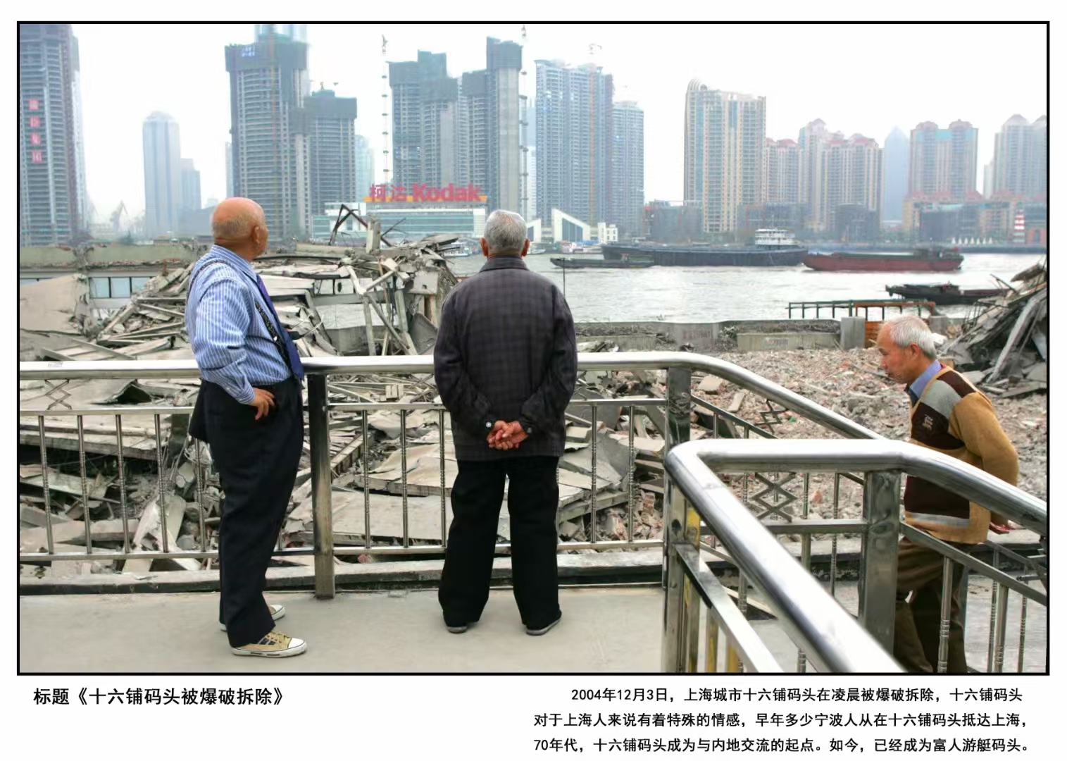 2004年12月3日凌晨零點五十九分,上海十六鋪客運碼頭候船大樓和申客飯店被成功爆破,走過140多年歷史的十六鋪客運碼頭告別歷史舞臺。上海市攝影家協(xié)會主席王杰指著拍攝的另一張照片回憶,“現(xiàn)在生活在上海的人,祖輩大部分大多是從十六鋪碼頭‘上’來的,特別是已經(jīng)定居上海的浙江寧波人,他們基本上都是從十六鋪碼頭登陸上海的,對于老上海人,十六鋪碼頭具有特殊的情懷”。