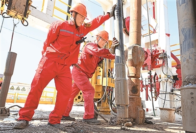 在山東省東營市勝利油田利斜856鉆井現場,勝利石油工程公司渤海50691鉆井隊員工進行起下鉆施工,加快石油勘探開發步伐。王國章攝(人民視覺)