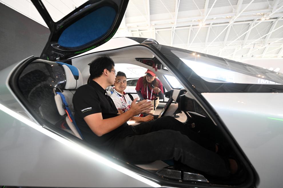 6月20日,參觀者在博覽會智能網聯汽車展區小鵬匯天展臺參觀體驗一臺飛行器。新華社記者 趙子碩 攝