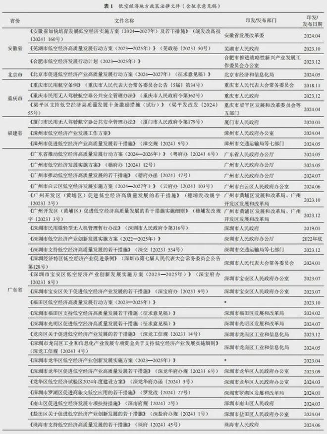 在地方性法規與規范性文件方面,各地政府積極響應國家號召,紛紛出臺了一系列促進低空經濟高質量發展的政策措施。例如,北京市、天津市、河北省、安徽省、江蘇省、浙江省、廣東省等地均發布了相關行動方案或若干措施,旨在推動低空經濟的產業發展、基礎設施建設、安全保障以及政策支持與激勵。以下為全國各省份低空經濟地方政策法律文件的匯總如表1所示: