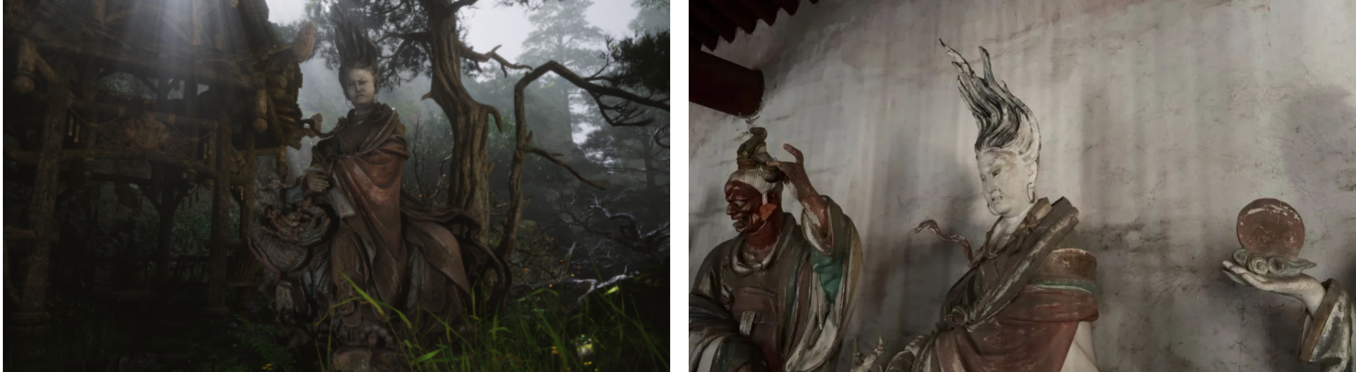 左圖為《黑神話:悟空》游戲中亢金龍的形象,右圖為二十八星宿殿內的亢金龍彩塑