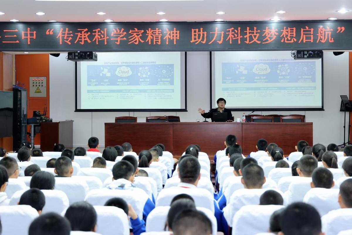 11月14日上午,“勇立潮頭 筑夢強(qiáng)國——弘揚(yáng)科學(xué)家精神”主題活動(dòng)走進(jìn)北京市平谷區(qū)第三中學(xué)。應(yīng)北京市科技教育中心(北京科協(xié)黨校)邀請(qǐng),飛諾門陣董事長、清華智能網(wǎng)絡(luò)計(jì)算實(shí)驗(yàn)室主任、格魯吉亞國家科學(xué)院外籍院士沈寓實(shí)博士為北京市平谷區(qū)第三中學(xué)200余名初中學(xué)生開展了主題為“傳承科學(xué)家精神,助力科技?jí)粝雴⒑健钡膶n}講座;本次活動(dòng)得到了市區(qū)兩級(jí)教委的大力支持。沈寓實(shí)董事長圍繞科技與經(jīng)濟(jì)的歷史發(fā)展進(jìn)深入剖析了當(dāng)前全球科技創(chuàng)新的新趨勢和新特點(diǎn),通過列舉科學(xué)家深耕產(chǎn)業(yè)發(fā)展的相關(guān)實(shí)例凸顯了科學(xué)家精神在推動(dòng)科技產(chǎn)業(yè)發(fā)展中的核心地位與不可替代的作用。沈寓實(shí)院士還對(duì)平谷區(qū)第三中學(xué)師生們提出殷切期望:希望學(xué)生們將科學(xué)家精神內(nèi)化于心、外化于行,勇于肩負(fù)起科技創(chuàng)新的重任,爭做促進(jìn)社會(huì)繁榮與發(fā)展的未來?xiàng)澚海幌M麑W(xué)校持續(xù)強(qiáng)化科技教育體系,致力于培育更多秉持科學(xué)精神、才華橫溢的杰出人才,為社會(huì)的進(jìn)步貢獻(xiàn)力量。