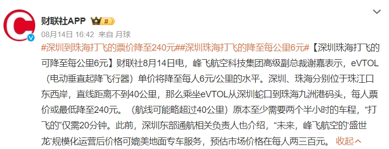 乘坐峰飛航空研發(fā)的“空中出租車”從深圳蛇口飛到珠海九洲港碼頭,每人票價最低可降至240元,比乘坐出租車還要便宜數(shù)十元不說,還把地面兩個多小時的車程縮短到了空中的20分鐘。峰飛航空科技集團(tuán)高級副總裁謝嘉表示,載人eVTOL的單價將降至每人6元/公里的水平。