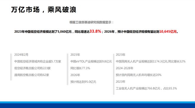根據(jù)工信部賽迪研究院散據(jù)顯示:2023年中國(guó)低空經(jīng)濟(jì)規(guī)模達(dá)到了5,060億元,同比增速達(dá)33.8%;2026年,預(yù)計(jì)中國(guó)低空經(jīng)濟(jì)規(guī)模有望達(dá)到10,645億元.